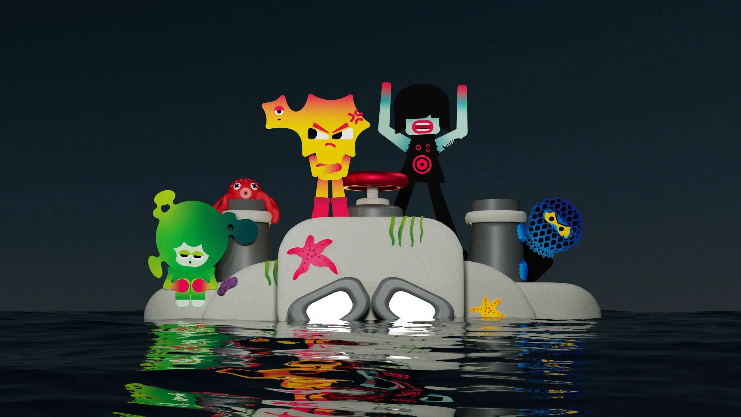My goal was to create distinct characters that children could easily associate with different types of ocean pollution, aiding their understanding and memory. Therefore, I designed five characters, each representing a type of ocean pollution—Plastic, Noise, Light, Industrial, and Nutrient —using minimal shapes and a limited colour palette to ensure they are memorable and easy for children to draw.